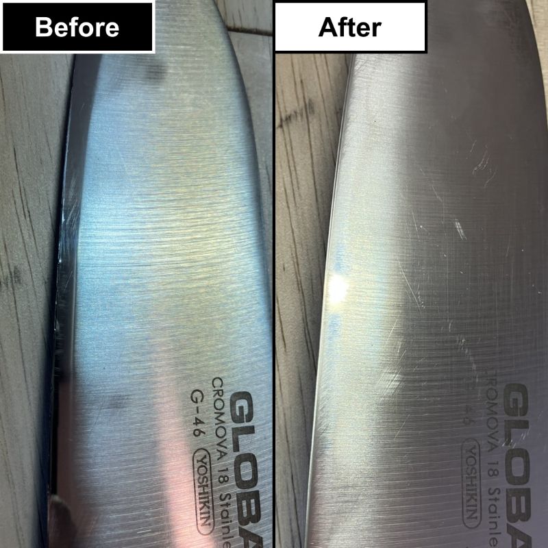 GLOBALの牛刀を研ぎました。刃渡り180mm、ステンレス一体型を代表する人気の高い包丁です。刃先に所々刃こぼれがありましたが、研いでよく切れるようになりました。