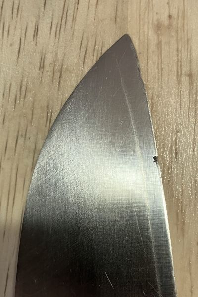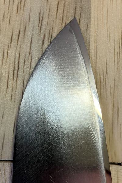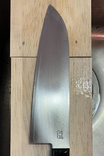 GOLD本割込の三徳包丁を研ぐ 2025.08.312025.09.14 三徳包丁を研ぎました。メーカーは不明、GOLD本割込の刻印があります。刃渡り168mm、ステンレスの三層鋼です。刃先は摩耗し、刃こぼれ、小さい錆がありましたが、プレミアムで研いでとてもよく切れるようになりました。 Before After Before After 参考料金 洋包丁 研ぎ【プレミアム】 1,300円 合計 1,300円 税込・デリバリー料別(2025年8月現在)