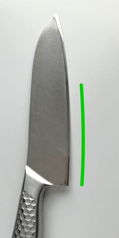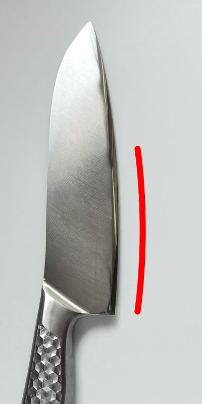当店でレンタルしている三徳包丁の刃線の形を変えました。刃渡り162mm、ステンレス製です。この包丁は刃線が太鼓腹のように丸く出っ張っています。使ってみると、まな板と接地する長さが短いために、野菜などの一部が切れ残りつながってしまうことがありました。刃線の形はメーカーが考えた使いやすいデザインのはずですが、個人的にはもっと直線的である方が好みなので、研いで形を変えることにしました。具体的には、刃線の一番膨らんだ部分を1~2mmほど削って、全体のバランスをみながらカーブをなだらかにしました。刃先が後退した分、厚みがでるので、プレミアムで研いで切れ味よく仕上げました。