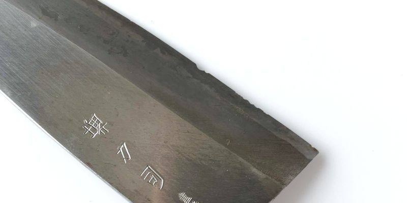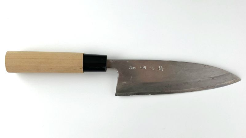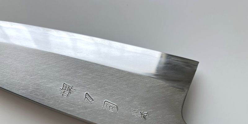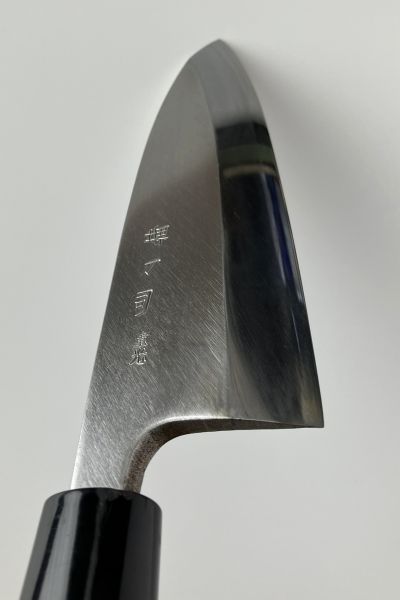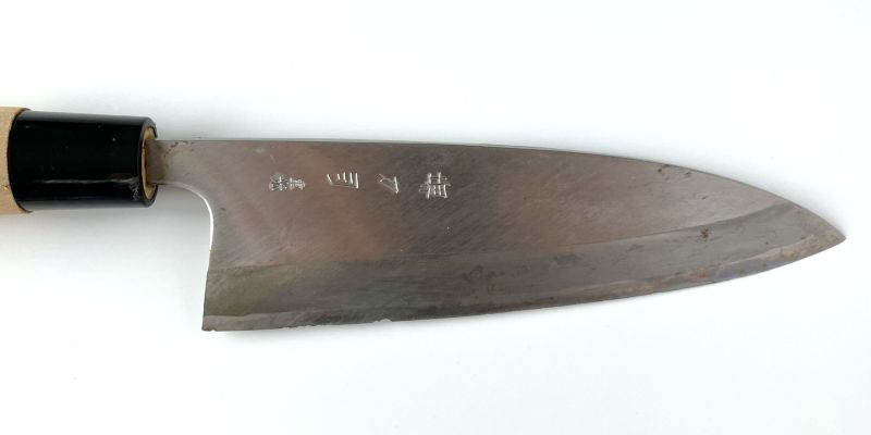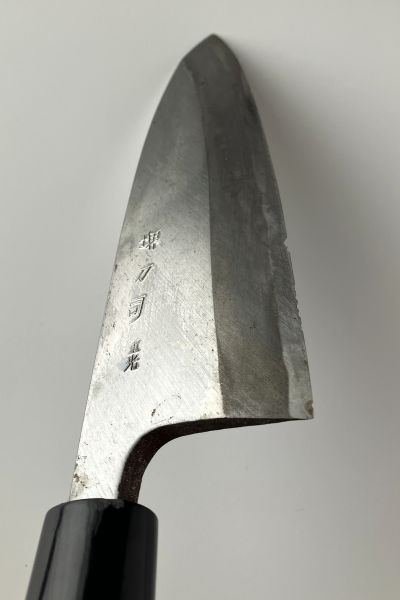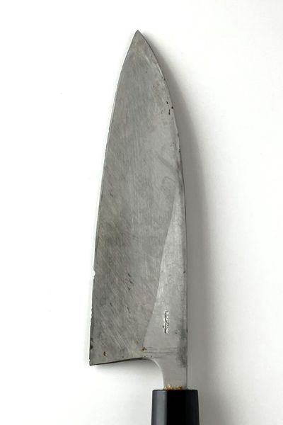 出刃包丁を研ぎました。堺刀司の重光です。刃渡りは170mm、鋼製です。刃元付近を中心に所々に欠けがあり、深さは最大で1mmです。欠けを修理すると刃先が後退し厚みがでるので、プレミアムで切り刃をすべて研ぎおろし、小刃付けして仕上げました。