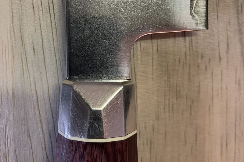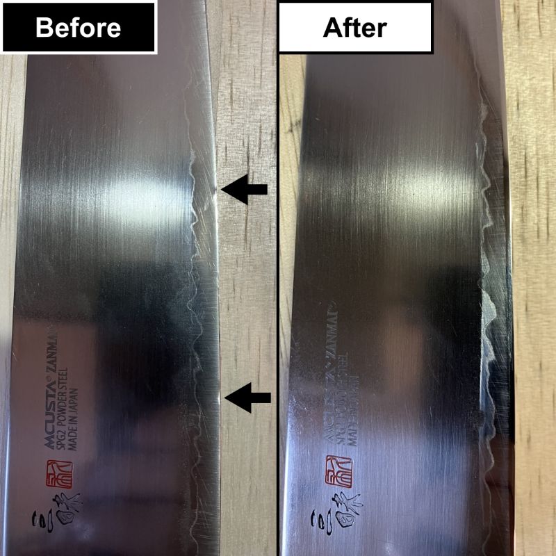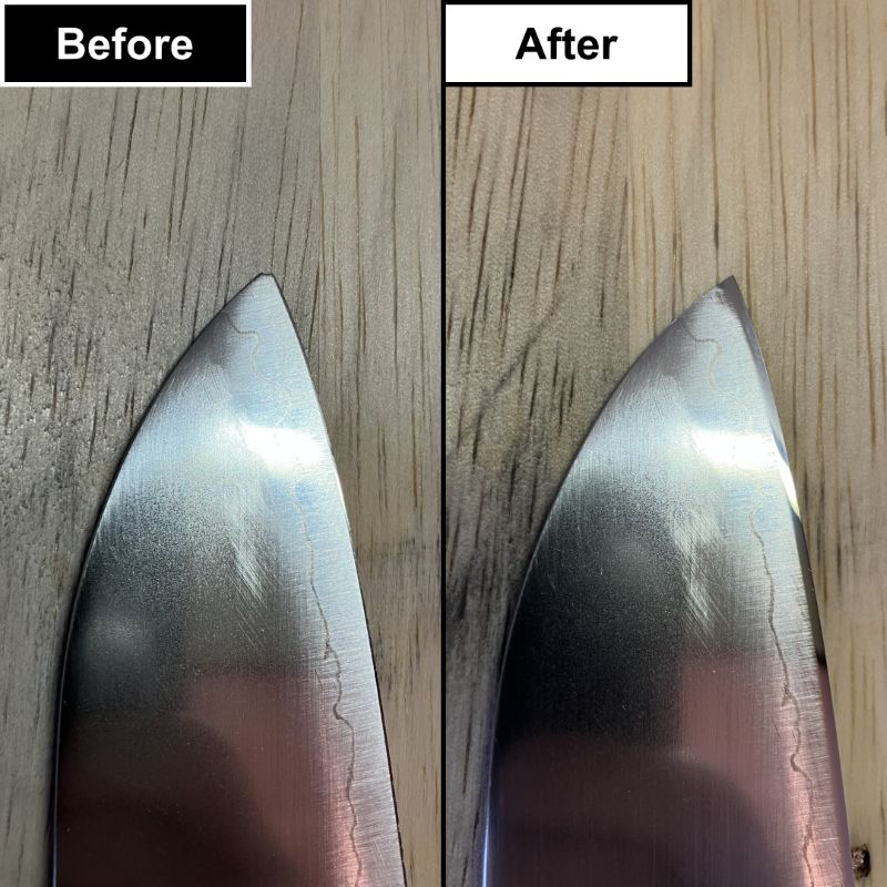 この包丁は、切っ先が小さく欠けていたので直しました。切っ先は、洗っているときにシンクなどにぶつけて欠けてしまうことがあります。使用上はあまり問題ありませんが、欠けたままだとやはり気になるものです。