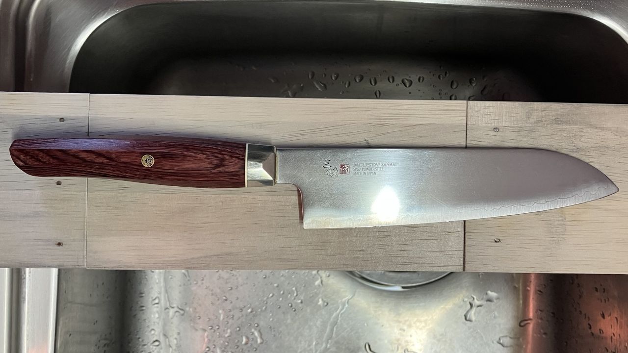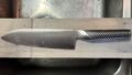 ZANMAIの牛刀を研ぎました。刃渡り178mm、SPG2の三層鋼で、柄のつくりを見てもとても立派な包丁です。刃先は一見きれいに見えましたが摩耗が進み、ほとんど切れませんでした。非常に硬いステンレスで研ぐのに難儀しましたが、プレミアムで研いでとてもよく切れるようになりました。